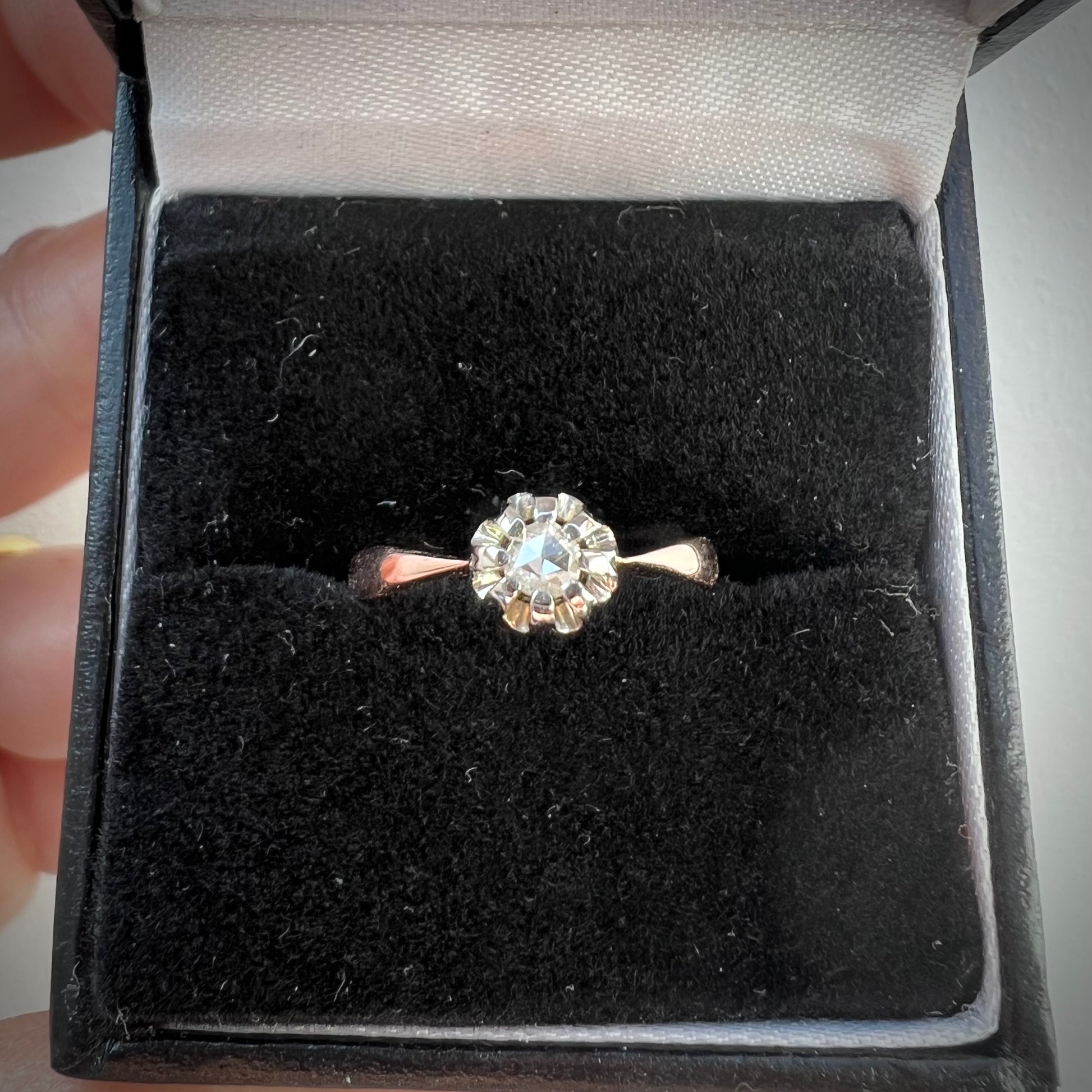 Bague ancienne en or 750 millièmes (18kt) centrée d'un diamant taillé en rose de 0,07ct, retenu par huit griffes en or blanc.