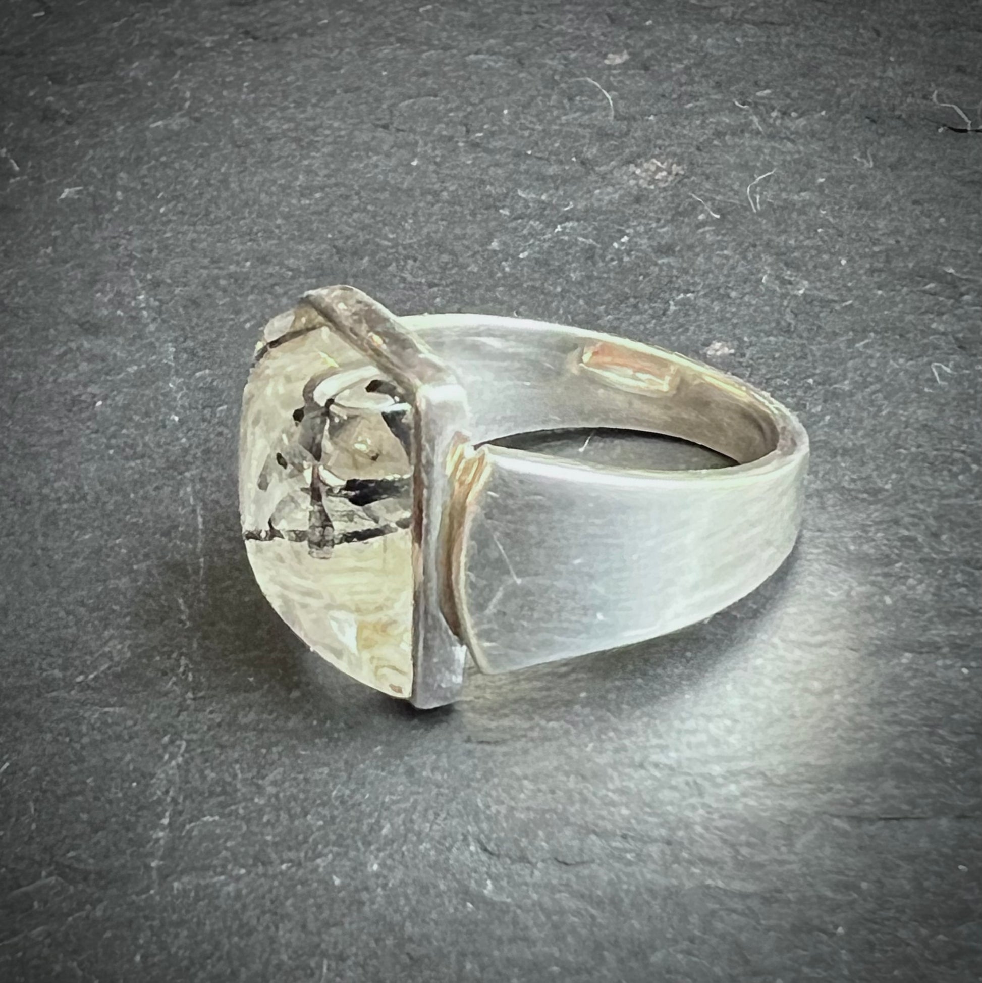 Bague centrée d'un cabochon rectangle de quartz Flèches d'Amour, cristal de roche inclus par des cristaux de tourmaline noire appelée schorl. Les inclusions de cette pierre lui offrent un caractère très particulier. Le design est équilibré fait penser au style moderniste.