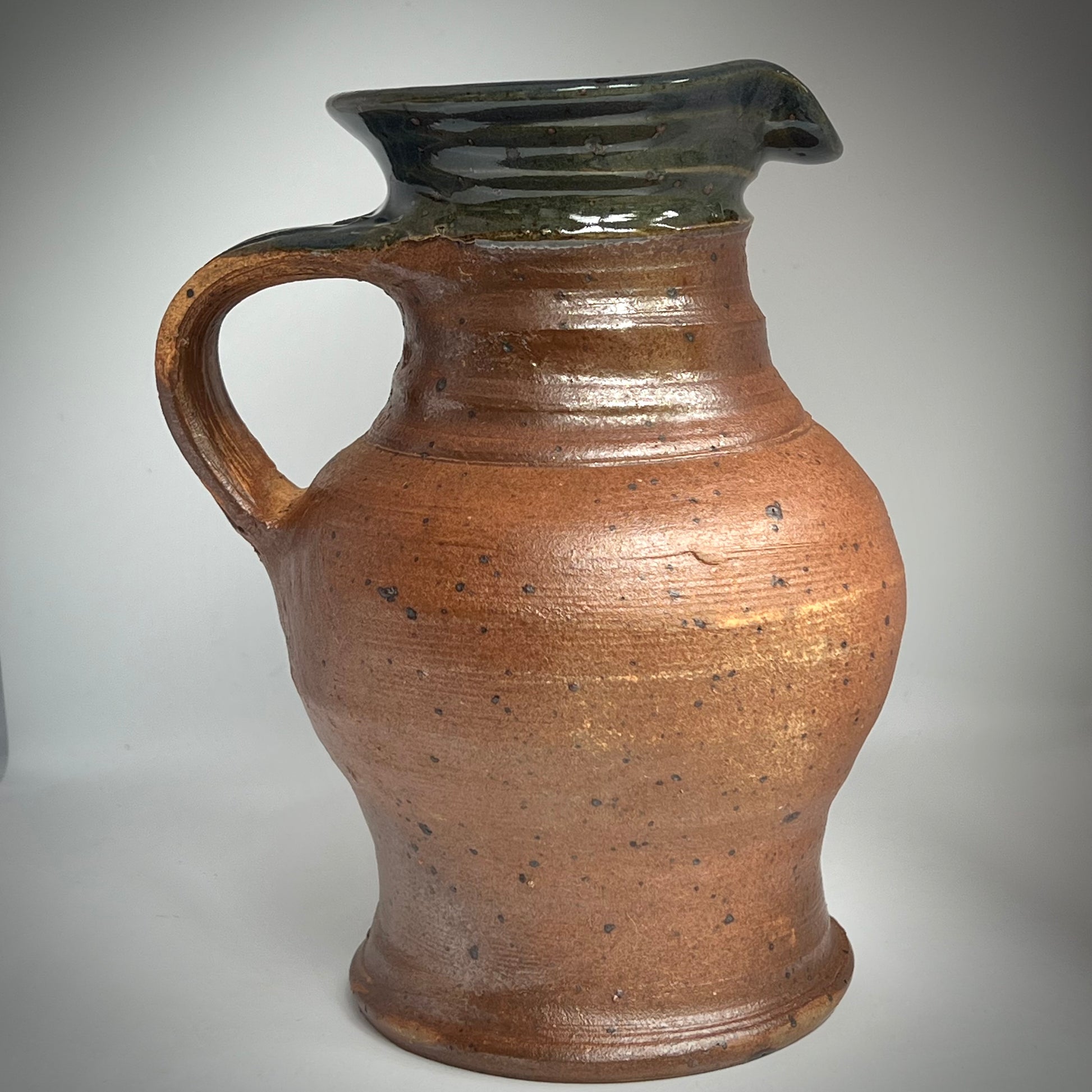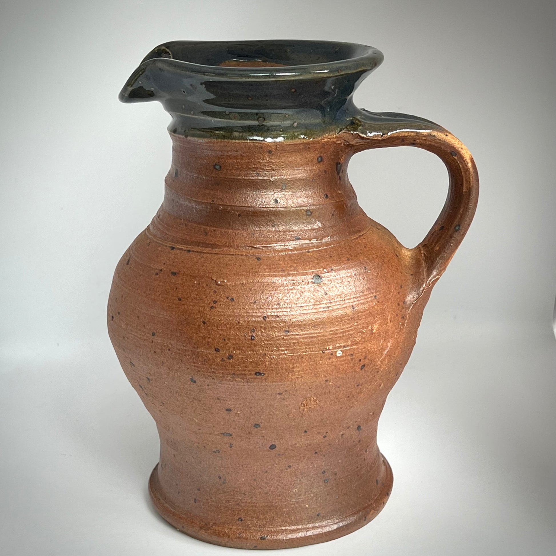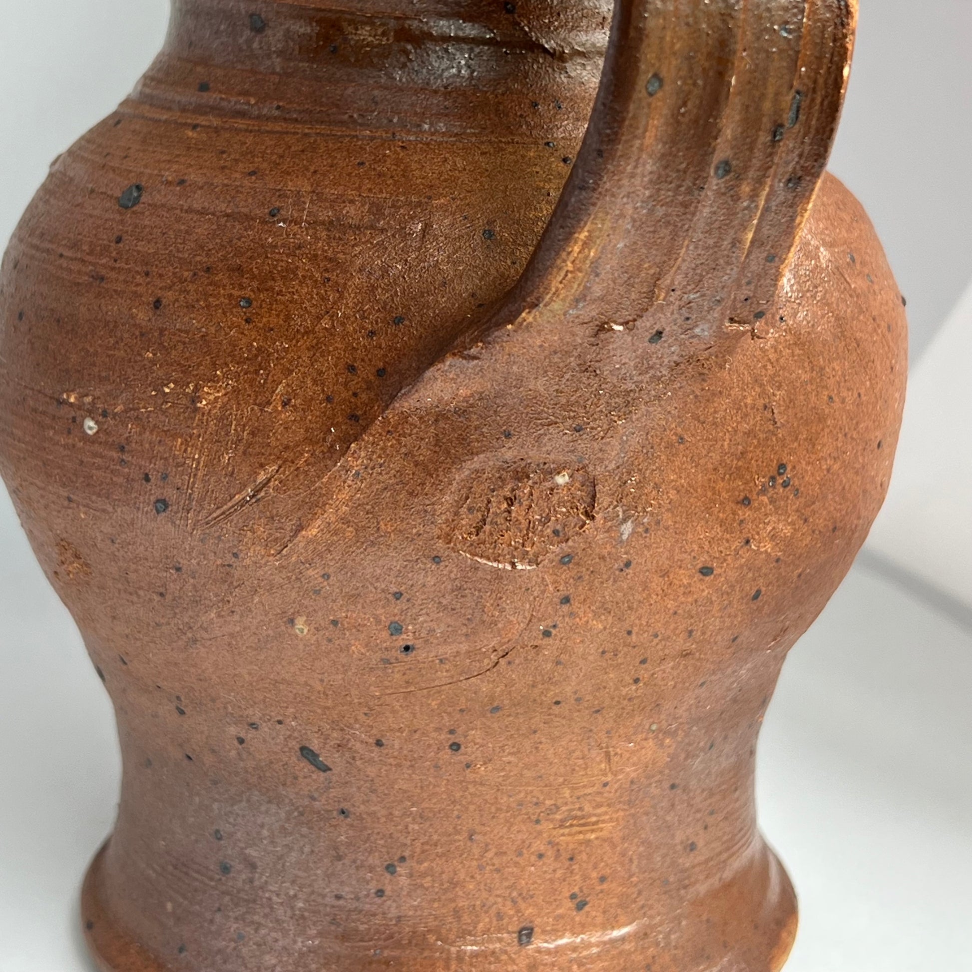 Excellent état. Manifestement très peu servi. Bec impeccable. Notez que les points noirs, coulures et petits trous sont en réalité les restes des petits grains de pyrite mélangés à la terre et fondus par la cuisson. Ils confèrent tout son cachet au grès.