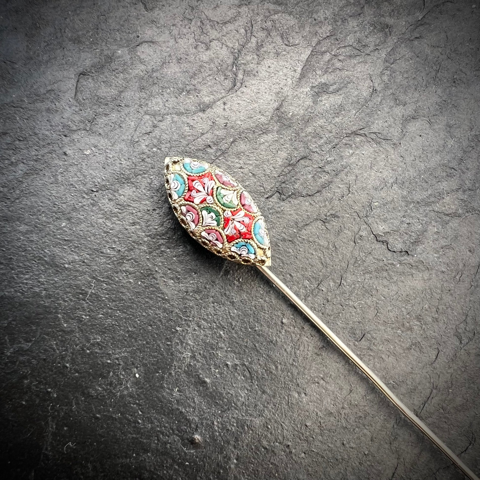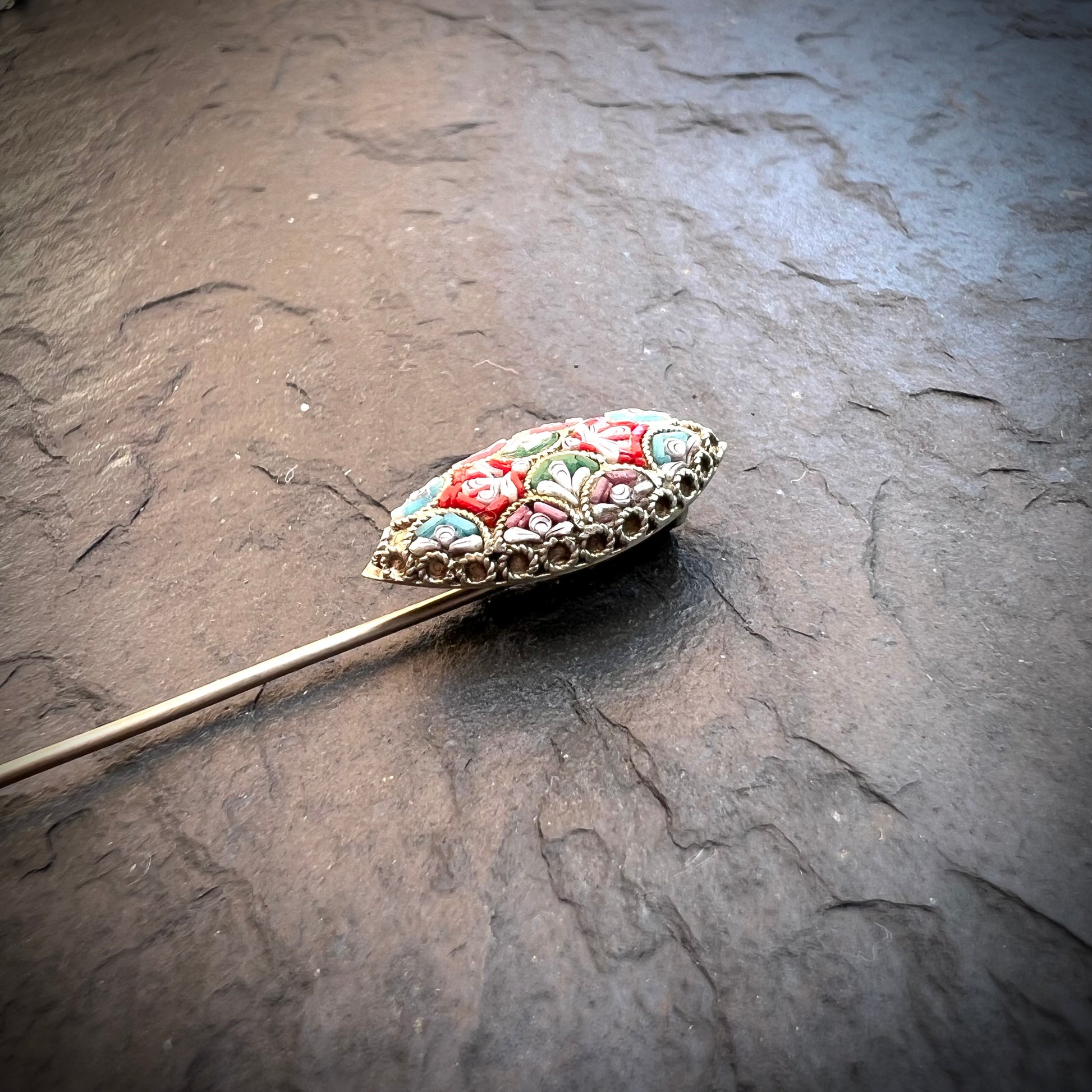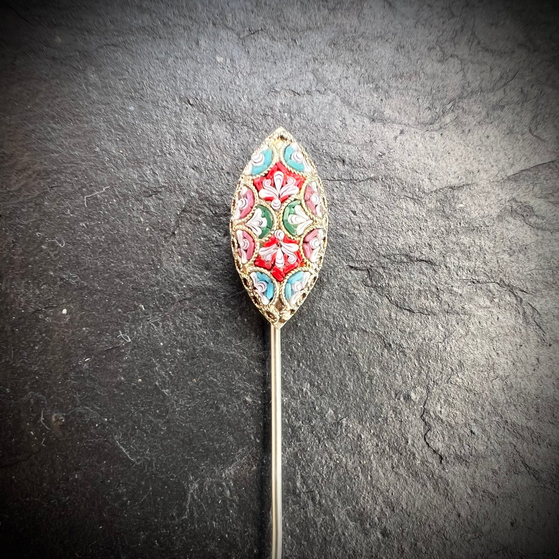 Épingle en micromosaïque sur argent (finition plaqué or dans le passé). Les tassels sont cloisonnés par des filigranes torsadés.