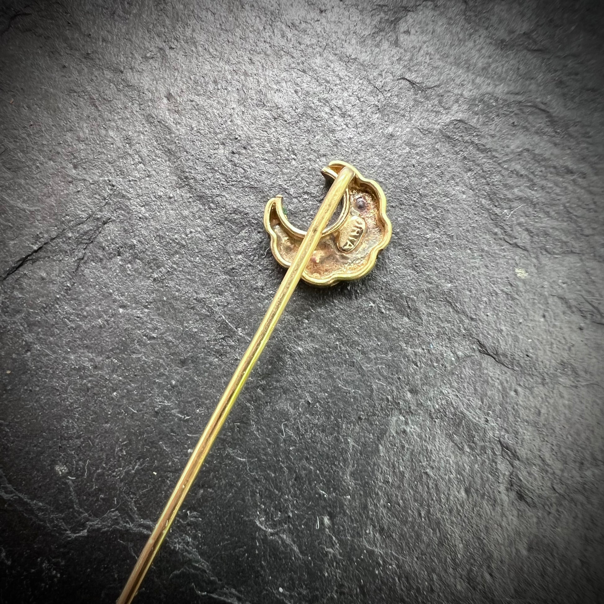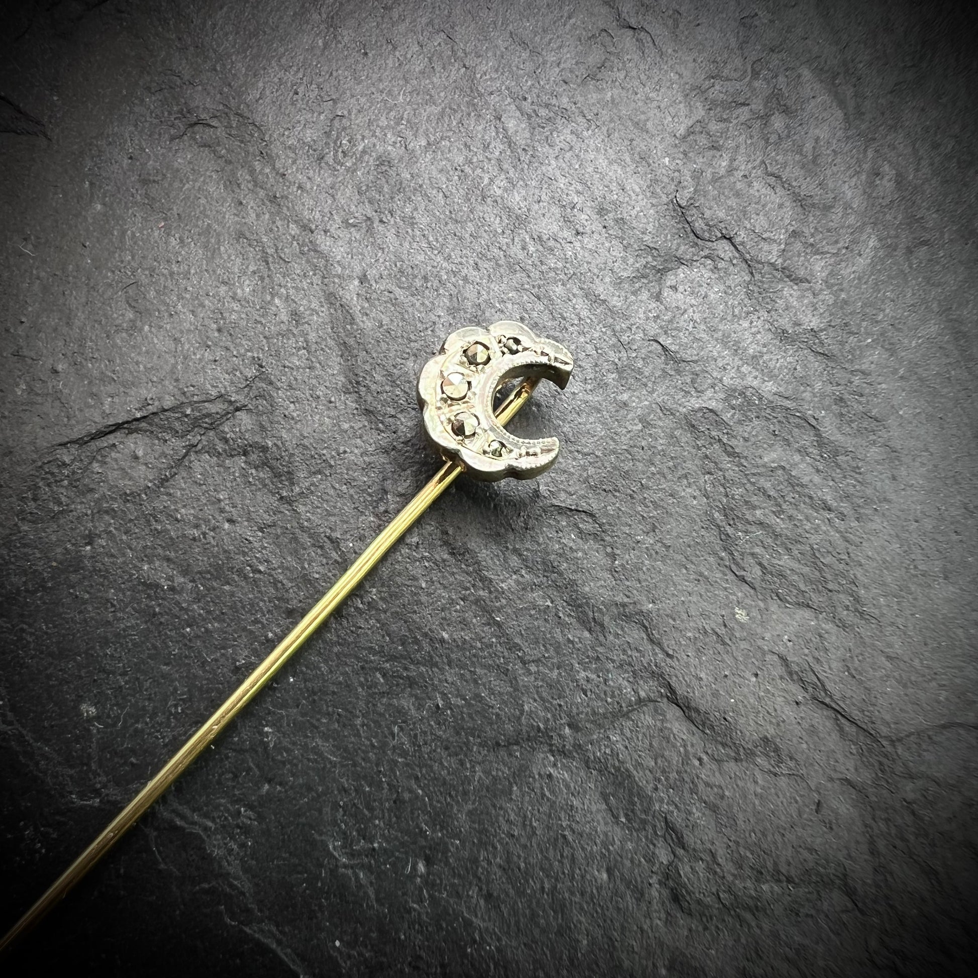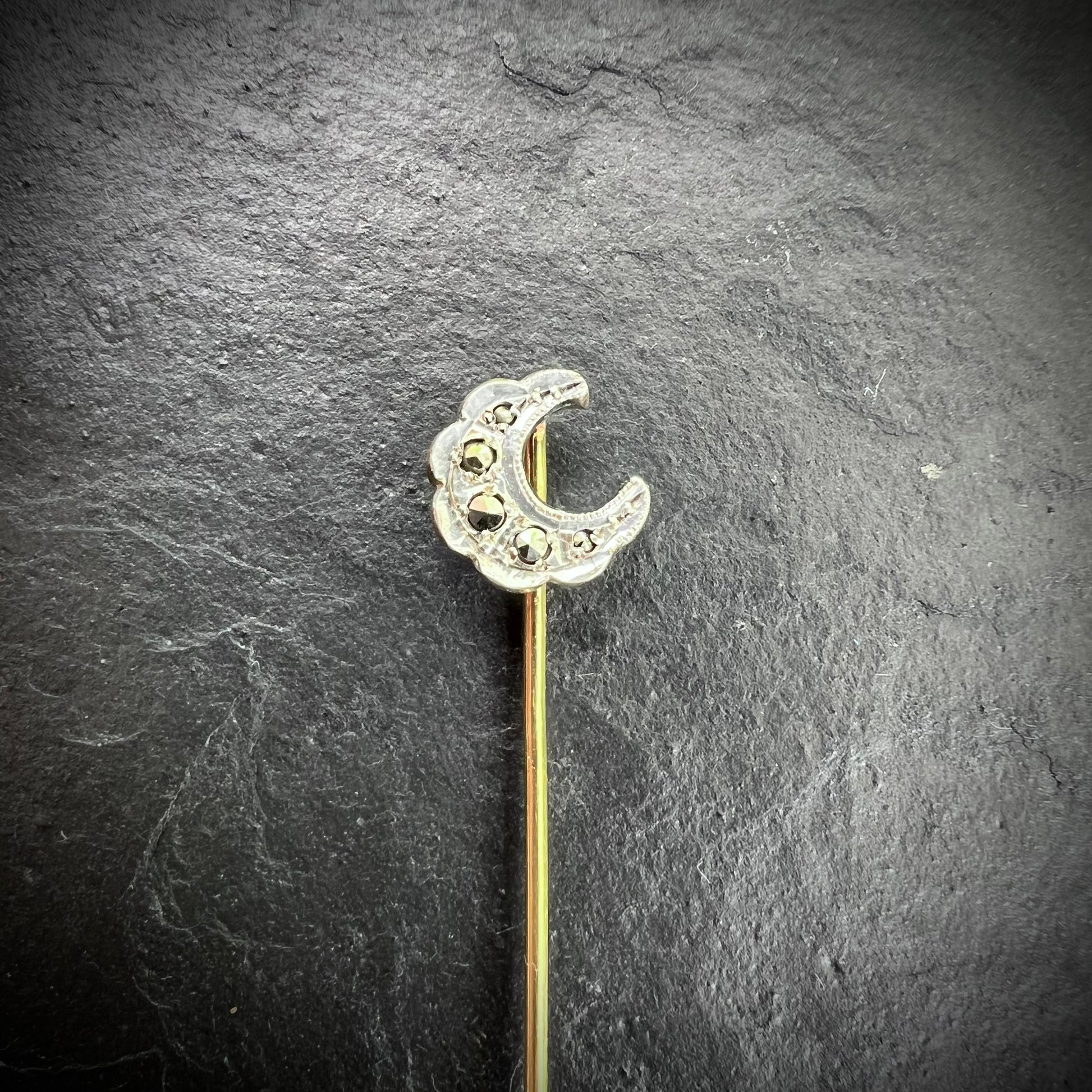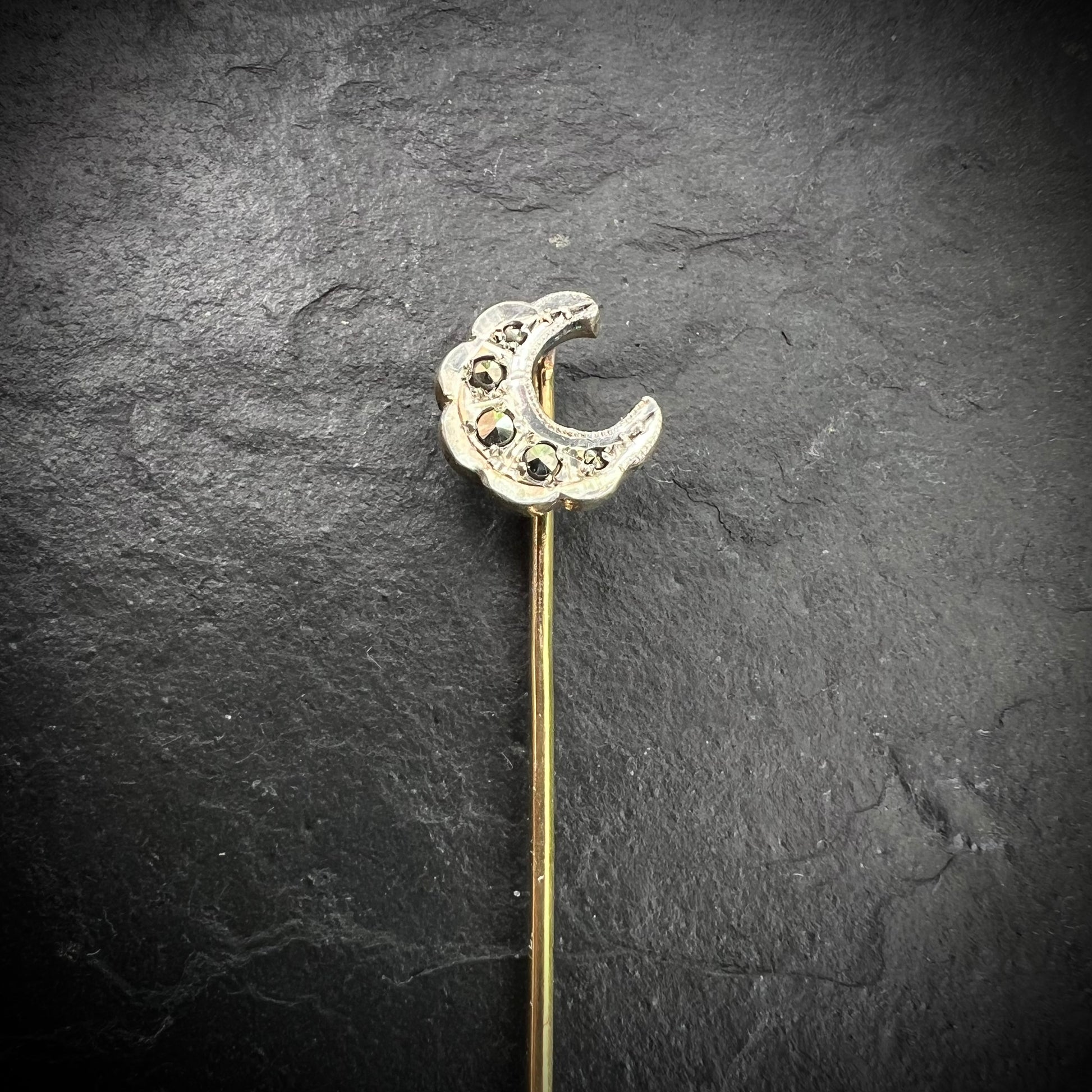 Epingle croissant de lune en métal plaqué or. La partie supérieure de la lune est plaquée argent et délicatement ornée de marcassites serti grain.